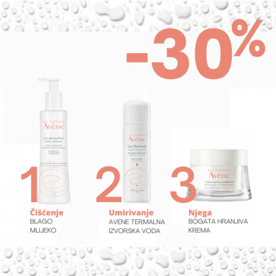 Virtuelna rutina sadrži: Blago mlijeko za čišćenje 200ml, Termalnu vodu 50ml i Bogatu hranjivu kremu 50ml