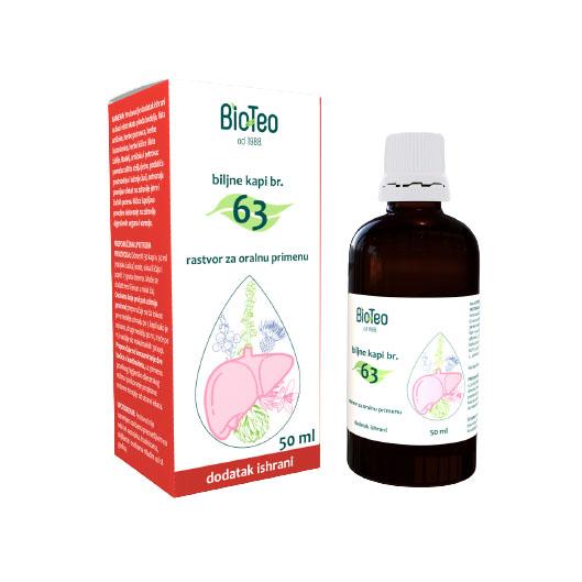 Bio-Teo biljne kapi br. 63 na bazi ekstrakata ploda badelja, lista artičoke i žalfije, herbe petrovca i korijena vodopije, prirodno su rješenje za normalnu funkciju jetre i normalno varenje. Svojim sastavom pomažu rad hepatobilijarnog sistema, podstiču proizvodnju i lučenje žuči, a time poboljšavaju varenje i štite jetru i žučne puteve.