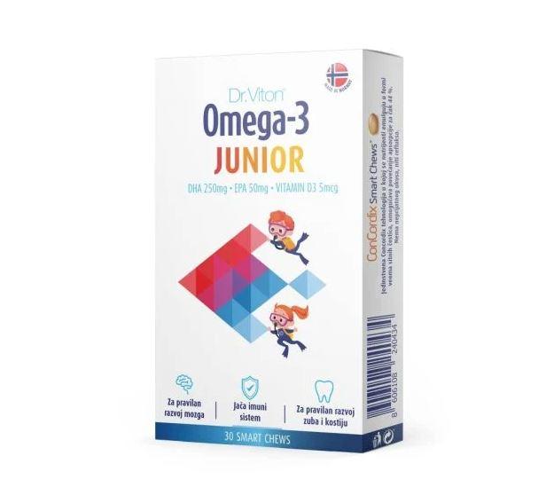 Dr. Viton Omega – 3 junior, 30 tableta za žvakanje namijenjene djeci koja imaju više od 3 godine. Upotrebom samo jedne tablete za žvakanje, unosi se preporučena dnevna doza omega – 3 masnih kiselina i vitamina D3.