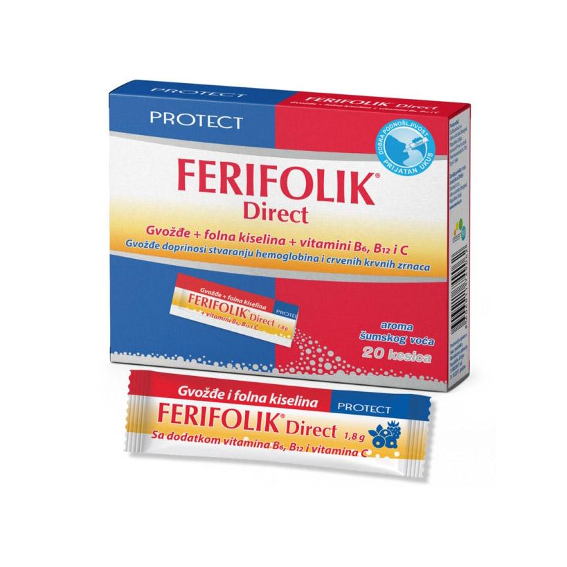 Ferifolik direct, prašak za direktnu primjenu, formulisan je na bazi željeza (u obliku feri-pirofosfata) i folne kiseline, uz dodatak vitamina B6 i B12, koji su neophodni nutrijenti za pravilan razvoj crvenih krvnih zrnaca, i vitamina C koji utiče na bolju iskoristljivost željeza. Preporučuje se: tokom trudnoće i laktacije, kod anemija uzrokovanih nedostatkom gvožđa i/ili folne kiseline, u stanjima umora i iscrpljenosti, u periodu priprema za trudnoću, za prevenciju predmenstrualnog sindroma i kod obilnih menstrualnih krvarenja.