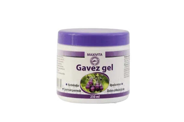 Gavez gel ublažava bolove kod kostobolje i smiruje upale vena. Koristi se kod slabe cirkulacije, sportskih povreda, uganuća, iščašenja, oteklina. Težina: 250 g