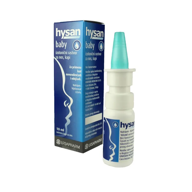 Otežano disanje kroz nos je problem vrlo često prisutan kod novorođenčadi i odojčadi koja ne mogu sama da ,,izduvaju nos”. Ovo za posledicu ima poremećaj sna i problem uzimanja tečnosti. Takođe, deca koja borave u suvim i zagrejanim prostorijama ili su prehlađena mogu imati problema sa suvom sluznicom nosa. Hysan Baby kapi sadrže prirodnu supstancu natrijum hijaluronat koja ima dvostruko dejstvo: formira dugotrajan i stabilan zaštitni film na sluzokoži i ima visok kapacitet vezivanja vode. Hysan baby je sterilan, izotonični rastvor koji ne sadrži konzervans ni potisni gas. Njegova primena momentalno omogućava slobodno disanje. Rastvor je sterilan 6 meseci nakon otvaranja. Pakovanje: 10ml.
