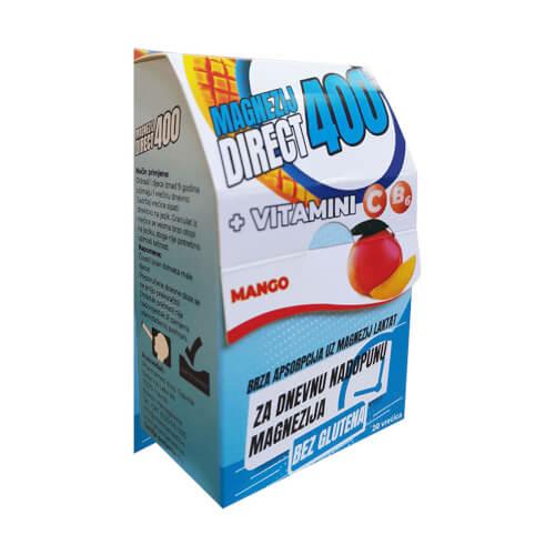 Magnezij 400 DIRECT sa egzotičnim okusom manga sadrži magnezij, vitamin C i vitamin B6. Magnezij doprinosi smanjenju umora i iscrpljenosti, normalnoj funkciji mišića i normalnoj psihološkoj funkciji. Magnezij pomaže kod glavobolje i stresa, a preporučuje se svim odraslim osobama, starijim osobama, sportistima i rekreativcima. Vitamin C doprinosi stvaranju kolagena neophodnog za izgradnju i normalnu funkciju mišića, tetiva, hrskavice i kože. Vitamin C doprinosi normalnoj funkciji imunološkog sistema. Vitamin B6 doprinosi normalnom metabolizmu stvaranja energije i normalnoj psihološkoj funkciji.