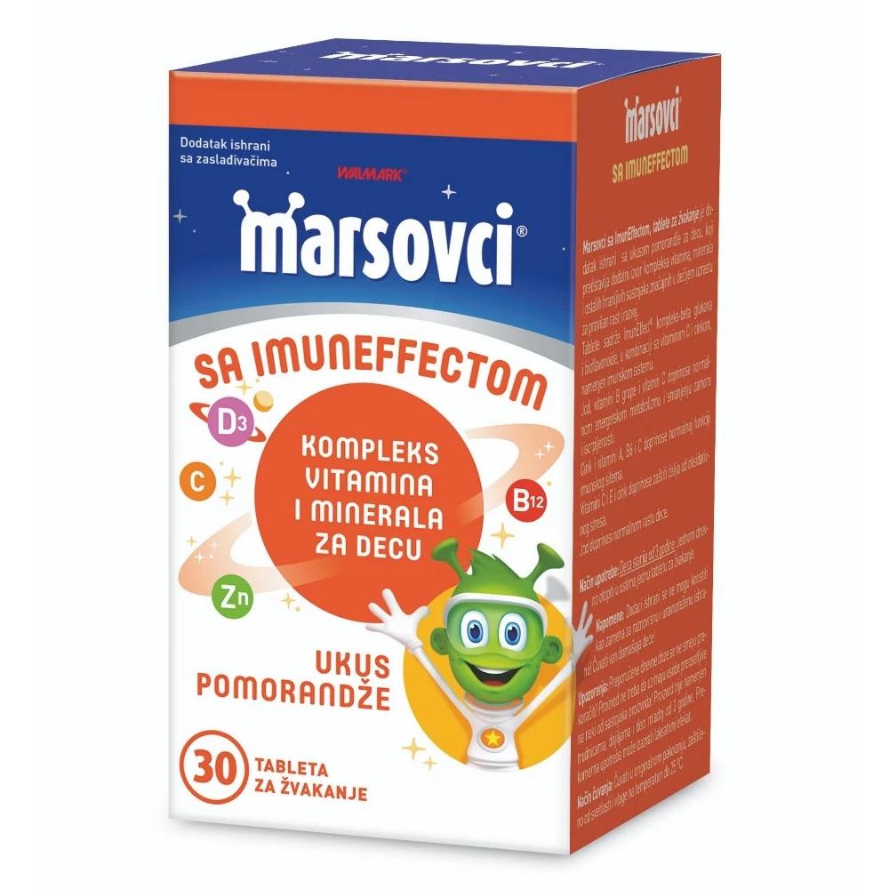 Marsovci® sa ImunEffectom, tablete za žvakanje je dijetetski suplement sa ukusom narandže za djecu, koji predstavlja dodatni izvor kompleksa vitamina, minerala i ostalih hranljivih sastojaka značajnih u dječijem uzrastu za pravilan rast i razvoj.