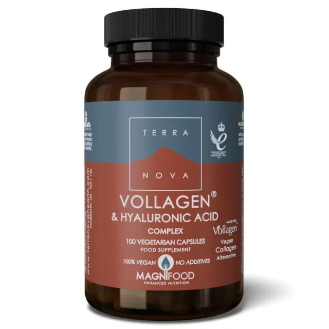 TERRANOVA Vollagen and Hyaluronic Acid Complex je napredni dodatak za podršku zglobovima i koži koji sadrži Vollagen, bio-identičan kompleks aminokiselina (peptida) koji se nalazi u istom omjeru kao oni koji se nalaze u ljudskom kolagenu. TERRANOVA kompleks volagena i hijaluronske kiseline – 50 kapsula kompleks volagena i hijaluronske kiseline posebno je dizajniran i poboljšan s MAGNIFOOD-om za podršku proizvodnji kolagena i integritetu kože, kose, noktiju, zglobova i tetiva. Zbog visoke bioraspoloživosti i crijevne propusnosti potrebne su daleko manje doze za postizanje optimalnih rezultata. Sadrži hijaluronsku kiselinu punog spektra molekularne težine. Podrška koži, kosi, noktima i zglobovima.