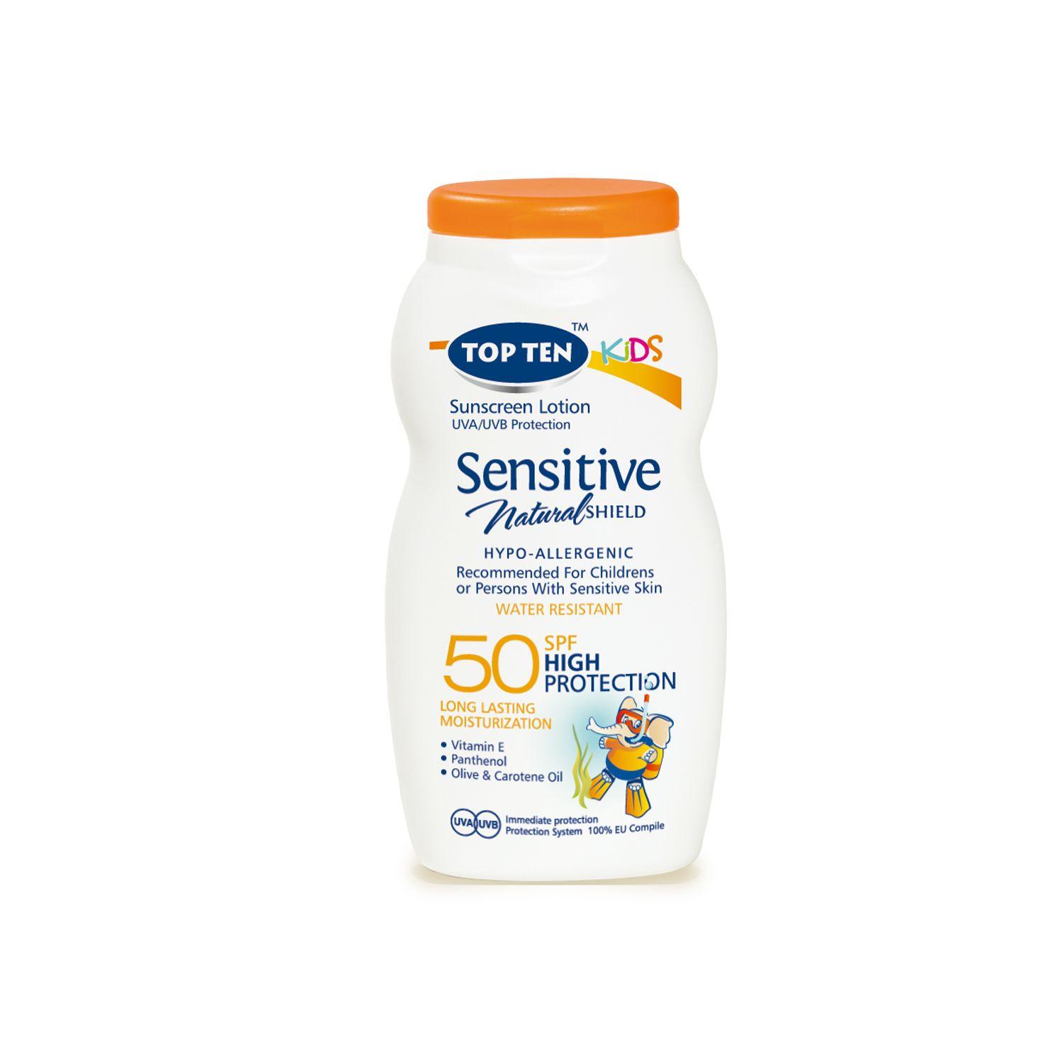 TOP TEN KIDS Sensitive Losion, sadrži vrlo efikasan uravnotežen sistem UVA/UVB filtera visokog faktora koji obezbjeđuje trenutnu i dugotrajnu zaštitu od sunca. Sadrži jedinstveni umirujući kompleks vitamina E, pantenola i prirodnih ulja mrkve i masline.